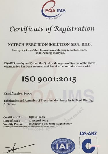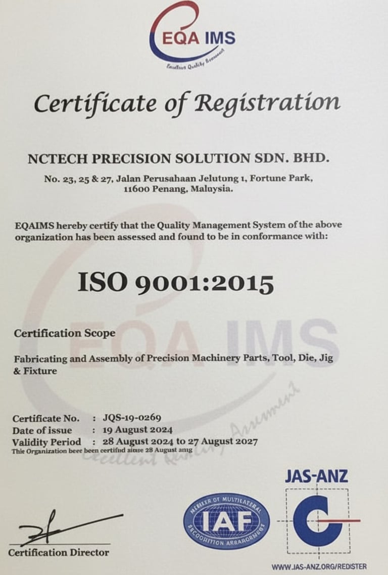 Attaining the prestigious ISO 9001 : 2015 Quality Management Systems accreditation by EQA IMS Certification Pte Ltd reflects NC TECH PRECISION SOLUTION SDN BHD firm commitment towards excellence to meet our customers’ demands.